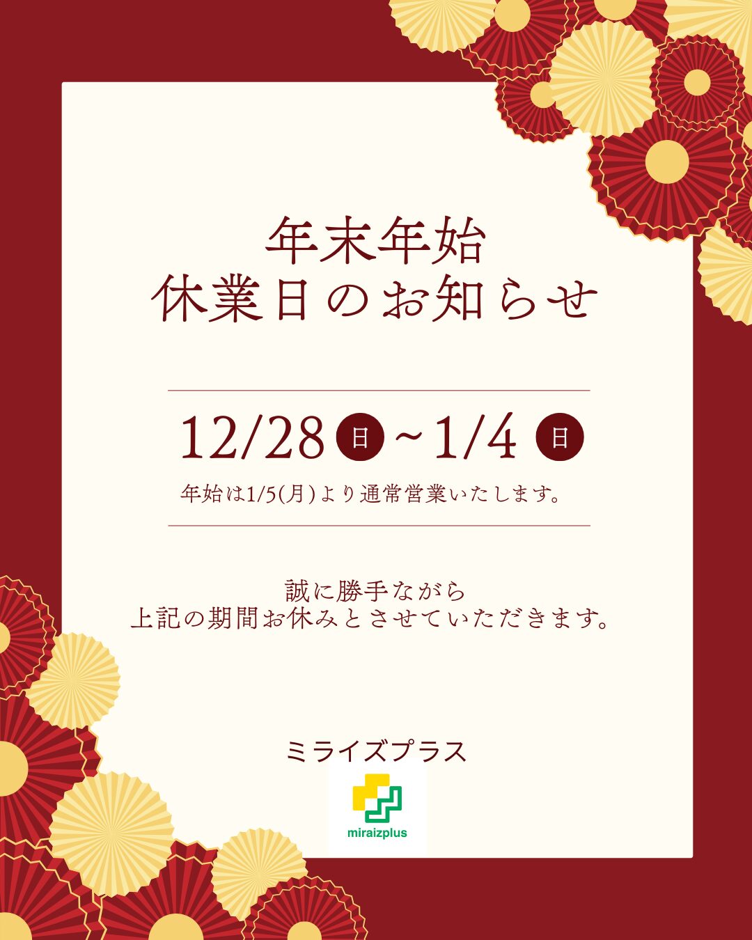 ミライズプラスでは、年末年始休暇の期間を以下の通りとさせていただきます。